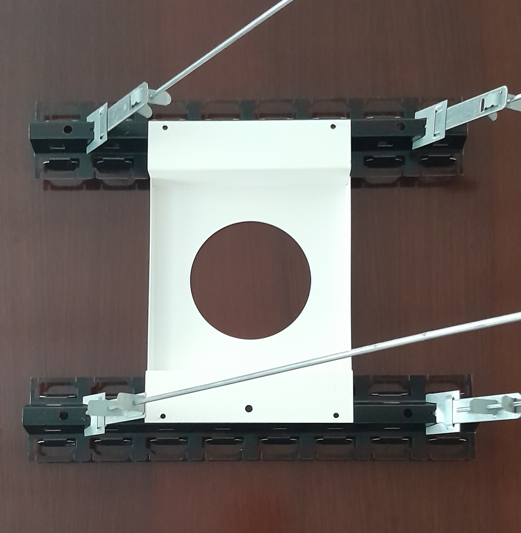 Lampen, Lüftung, Sprinkleranlagen, etc. können mit systemkonformen Zusatzmodulen in die Decke integriert werden. Zusatzmodule und auch Revisionstüren müssen separat abgehangen werden. Zusatzmodule werden im Modul 200, 184x184 mm und Modul 300, 284x284 mm mit separaten Tragschienen geliefert. Loch Maße werden vom Kunden vorgegeben. Revisionstüren können mit Nonius-Abhängern oder Gewindestangen auf jeder Ecke montiert werden.Planheit im Randbereich
